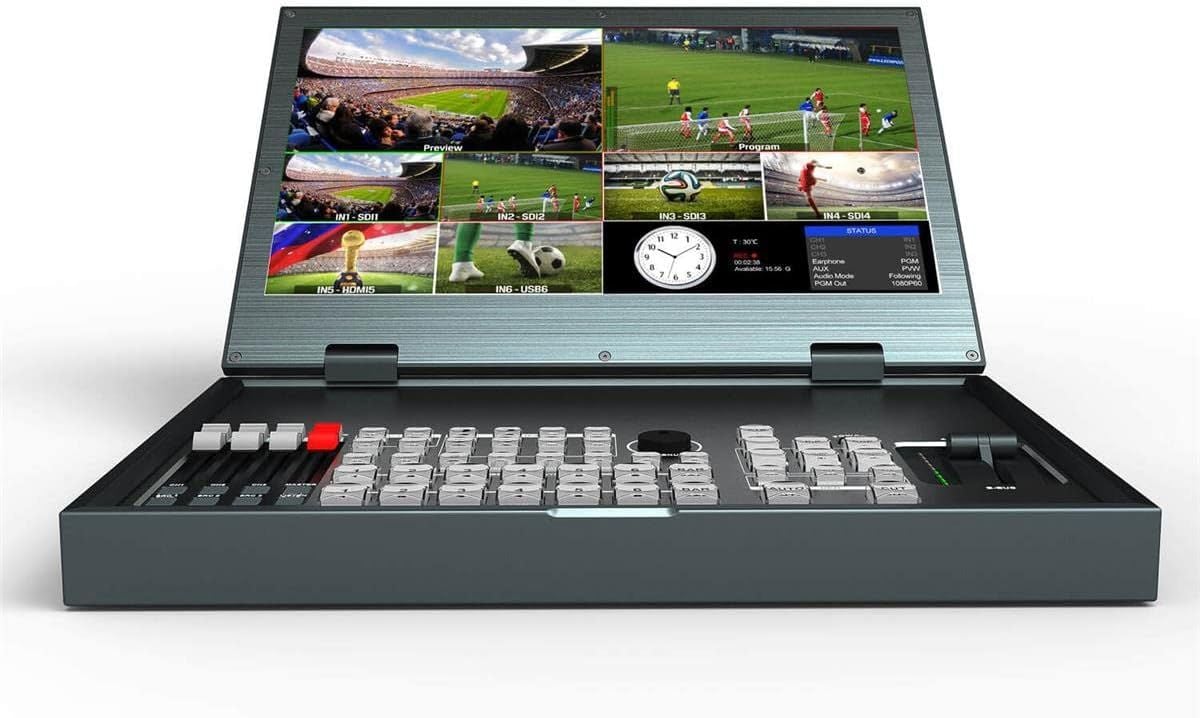 - Tất cả các tín hiệu có thể được chia tỷ lệ thành 1080p60 hoặc 1080i60 trên đầu ra PGM thông qua SDI/HDMI. Bộ chuyển đổi được đặt trong vỏ kim loại chắc chắn và có màn hình 15,6 inch Full HD cùng các nút điều khiển chuyển mạch quen thuộc, bao gồm thanh chữ T.