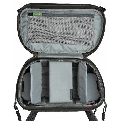 Phần dưới cùng của gói máy ảnh xoay độc lập với phần trên cùng để truy cập nhanh vào bên trong 10L chứa thân máy ảnh DSLR hoặc máy ảnh không gương lật tiêu chuẩn, không có báng cầm, cùng với ba ống kính hoặc ống kính 24-700mm 2.8 đi kèm.