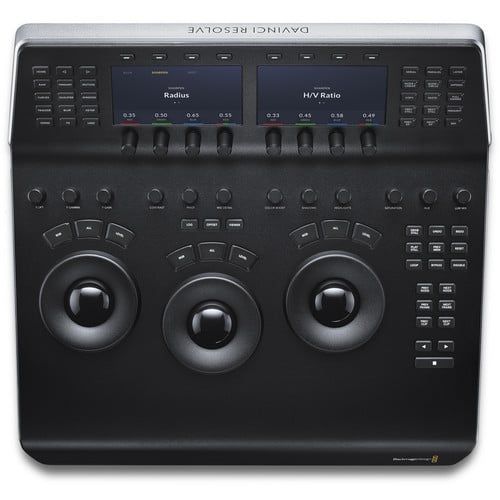 - Bảng điều khiển DaVinci Resolve Mini của Blackmagic Design là một bước tiến về chức năng so với bảng điều khiển Micro nhưng không có tất cả các tính năng của bảng điều khiển Advanced và bao gồm phần mềm DaVinci Resolve Studio. Đây là bề mặt điều khiển di động phù hợp với những người cần chuyển đổi giữa chỉnh sửa và phân loại màu. Nó có thể đặt trên máy tính để bàn hoặc trong giá đỡ hoặc có thể được bắt vít vào bề mặt. Giống như bảng điều khiển Micro, nó có ba trackball có trọng lượng độ phân giải cao và 12 núm điều khiển để truy cập các công cụ hiệu chỉnh màu chính cần thiết trong phần mềm Resolve. Mười tám phím chuyên dụng ở bên phải cũng cho phép bạn truy cập vào các tính năng phân loại và điều khiển phát lại được sử dụng phổ biến nhất.