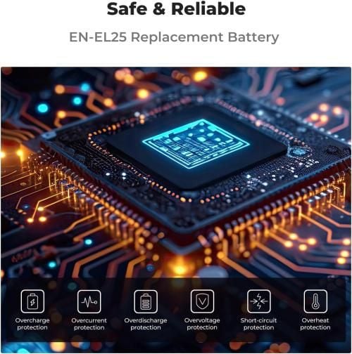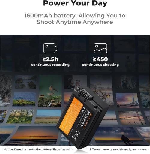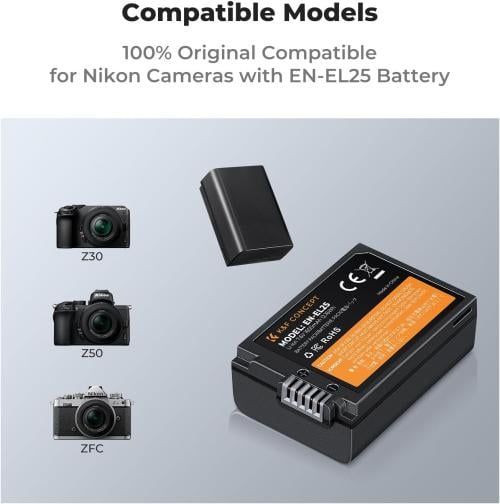 - Dung lượng pin mạnh mẽ 1600mAh. Bộ sạc pin K&F Concept EN-EL25/EN-EL25A có dung lượng pin mạnh 1600mAh, mang lại thời gian chụp ảnh hoặc quay video lâu hơn.