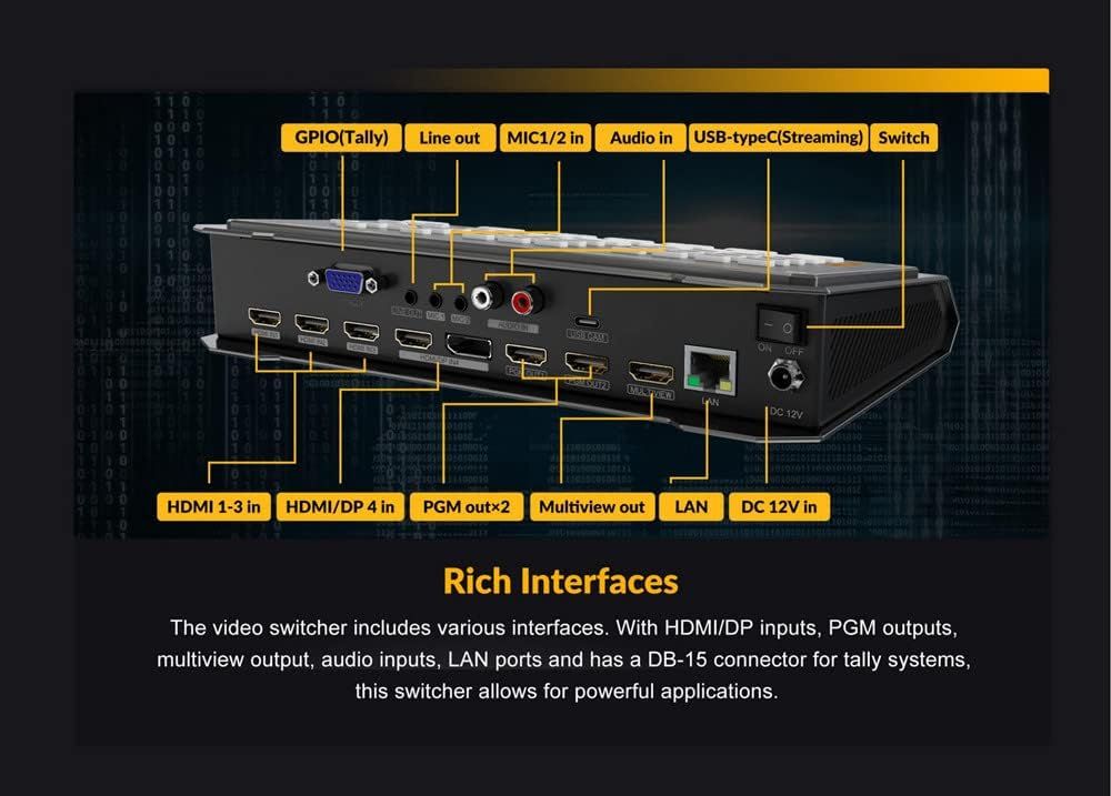 - Đầu ra video: PGM: HDMI loại A x2; Multiview: HDMI type-A xl USB Capture: USB type-C x