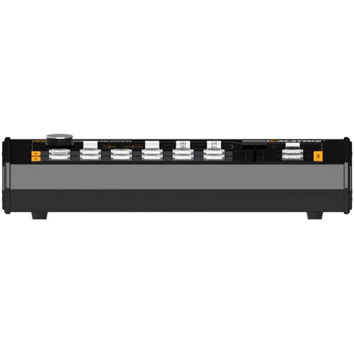 - Giao diện của nó có các nút nguồn và đích và thanh T để chuyển tiếp và cắt cũng như hiệu ứng trộn, mờ dần và xóa. Nó có giao diện tally và chức năng mờ dần thành đen (FTB) khẩn cấp.