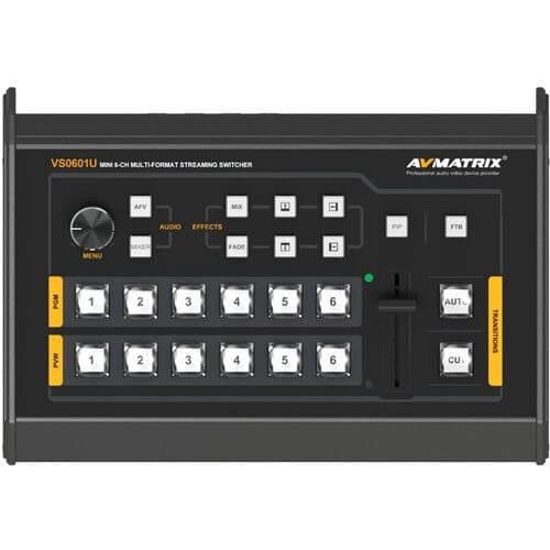 - Chuyển đổi tối đa sáu đầu vào video HDMI và SDI khác nhau trong khi theo dõi nguồn cấp chương trình bằng Bộ chuyển mạch AV đa định dạng SDI/HDMI 6 kênh Mini VS0601U từ AVMATRIX .