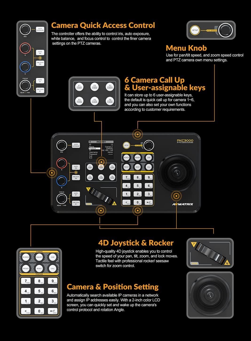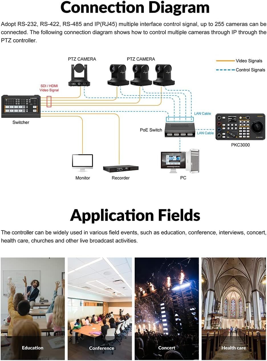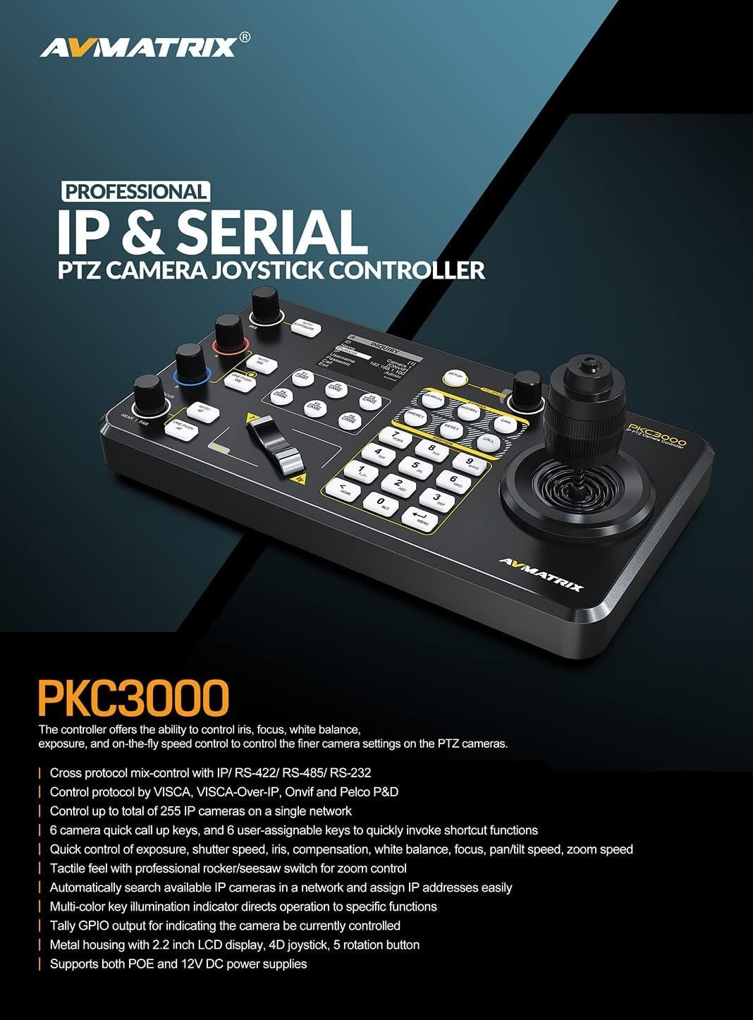 - Bộ điều khiển cần điều khiển camera PTZ nối tiếp & IP chuyên nghiệp của AVMATRIX cung cấp khả năng điều khiển nối tiếp và dựa trên IP cho tối đa 255 camera PTZ trong môi trường đa giao thức. Bộ điều khiển cung cấp các chế độ ONVIF và VISCA-over-IP cũng như các chế độ nối tiếp VISCA, Pelco-P và Pelco-D hỗ trợ giao tiếp IP/RS-232/422/485.