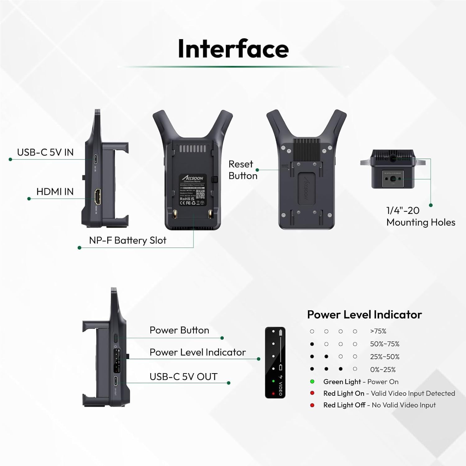 - 1 máy phát đến 4 máy thu Hỗ trợ ứng dụng Accsoon SEE. Hệ thống truyền video không dây Nano hỗ trợ truyền cùng một video từ camera tới 4 thiết bị iOS/Android dưới dạng màn hình. Đảm bảo độ phân giải đầu ra video HD và giám sát dễ dàng.