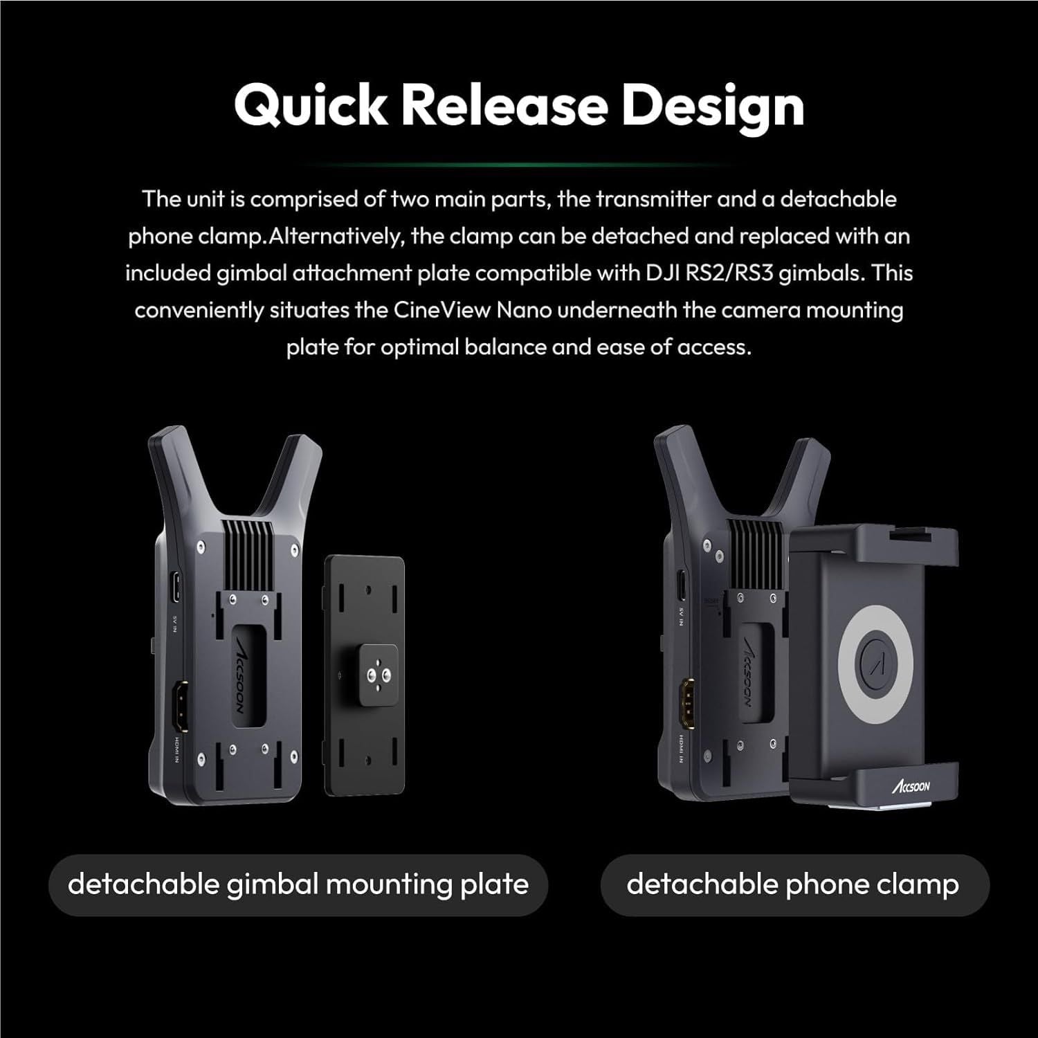 - Bộ phát video không dây Accsoon CineView Nano được thiết kế để truyền video trực tiếp tới các thiết bị iOS hoặc Android để thực hiện việc điều khiển nhiều thiết bị. Cổng đầu vào HDMI kết nối với máy ảnh/máy quay. Sẽ là một ý tưởng tuyệt vời khi sở hữu một bộ phát video không dây nhỏ và nhẹ để quay phim chuyên nghiệp.