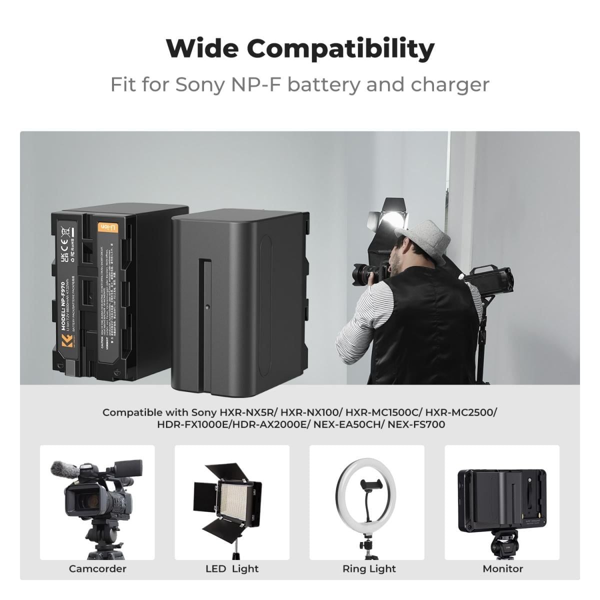 - Khả năng tương thích rộng Pin NP-F970 hoàn toàn tương thích với máy ảnh và bộ sạc chính hãng Sony, được giải mã hoàn toàn mà không bị hiệu ứng nhớ. Sản phẩm phù hợp với pin Sony NP-F960/NP-F950/NP-F930/NP-F770/NP-F750/NP-F550/NP-F570 và tương thích với các máy quay như HXR-NX5R/HXR-NX100/HXR-MC1500C/HXR-MC2500/HDR-FX1000E/HDR, cũng như đèn chụp ảnh, màn hình, thanh trượt máy ảnh cơ giới, hệ thống lấy nét không dây, v.v.