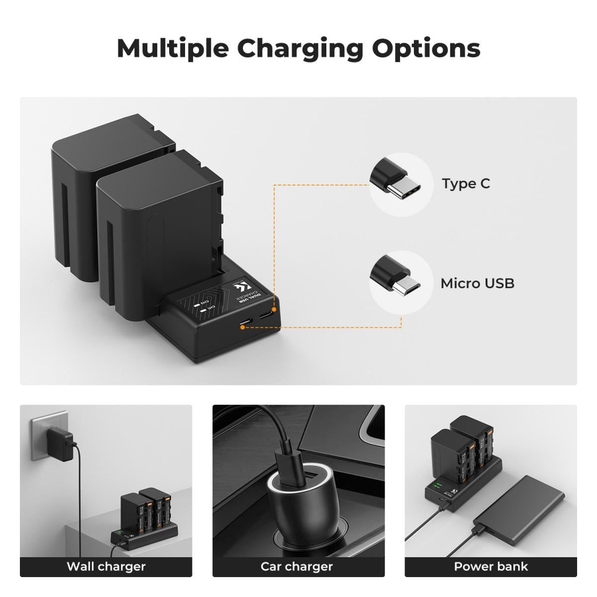 - Sản phẩm bao gồm 2 pin NP-F970, 1 bộ sạc pin hai khe cắm, 1 cáp Micro USB và 1 sách hướng dẫn sử dụng.
