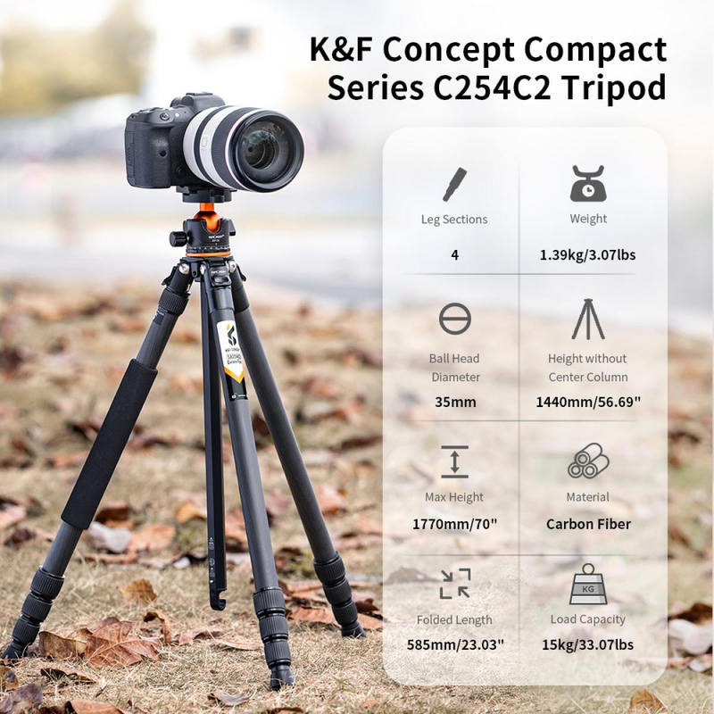 - Vật liệu chất lượng - Sợi carbon Chân máy ảnh K&F Concept A254C4+BH-35L được làm bằng vật liệu sợi carbon chất lượng để hỗ trợ chắc chắn hơn, chống chịu thời tiết/ăn mòn/trầy xước nhiều hơn và nói chung, cứng hơn nhôm. Chân máy chỉ nặng 3lbs/1,4kg, dài 23"/585mm khi gập lại, siêu nhẹ và nhỏ gọn với khả năng chịu tải lên tới 33lbs / 15kg, lý tưởng để chụp ảnh trong nhà và ngoài trời.