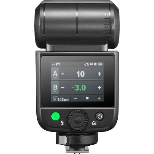 - Đầu đèn flash có khả năng xoay linh hoạt, nghiêng từ -7° đến 120° và xoay 330°, giúp dễ dàng phản chiếu ánh sáng một cách sáng tạo từ tường hoặc trần nhà. Đầu zoom tự động/thủ công bao phủ phạm vi tiêu cự 24–105mm, và bảng điều khiển bắt sáng tích hợp cùng bộ khuếch tán góc rộng mở rộng bộ công cụ chiếu sáng trên máy ảnh của bạn mà không cần bộ điều chỉnh bên ngoài.