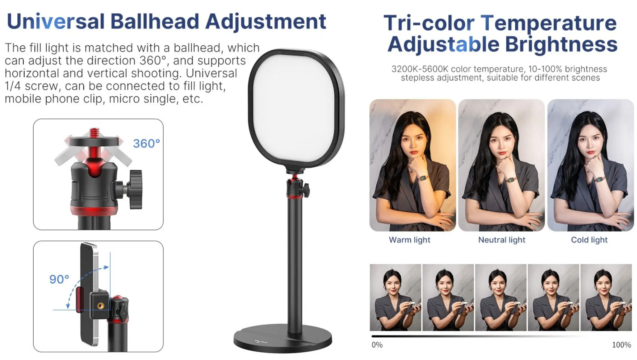 - ĐÈN LED ĐỔI 3 MÀU (3200-5600K) KÈM CHÂN TRIPOD ĐỂ BÁN CÓ THỂ ĐIỀU CHỈNH ĐỘ CAO, BALLHEAD XOAY 360°