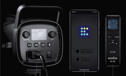 - Vận hành trực quan trên bo mạch, điều khiển từ xa RC-R9 tùy chọn và điều khiển không dây từ điện thoại của bạn với Ứng dụng Godox Light