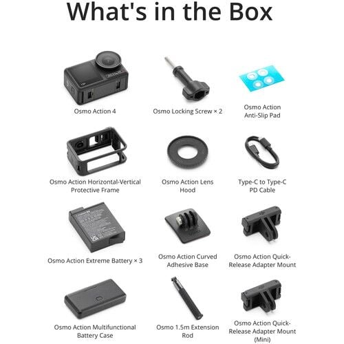 Ghi lại cảnh quay ổn định, độ phân giải cao trong hầu hết mọi tình huống với Combo Phiêu lưu Máy ảnh Osmo Action 4 từ DJI. Osmo Action 4 có nhiều tính năng tương tự như người tiền nhiệm của nó, như màn hình kép, hệ thống ổn định RockSteady và HorizonSteady cũng như thân máy chống thấm nước. Cảm biến lớn hơn một chút với số MP cao hơn, chế độ màu D-Log M 10-bit mới và khe cắm thẻ nhớ microSD được nâng cấp có khả năng hỗ trợ kích thước thẻ lớn hơn tạo nên thiết kế cải tiến của Action 4. Combo Phiêu lưu vượt xa Combo Tiêu chuẩn bằng cách thêm nhiều pin hơn, hộp đựng pin đa chức năng và thanh nối dài chụp ảnh tự sướng.