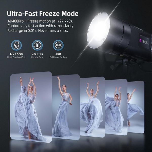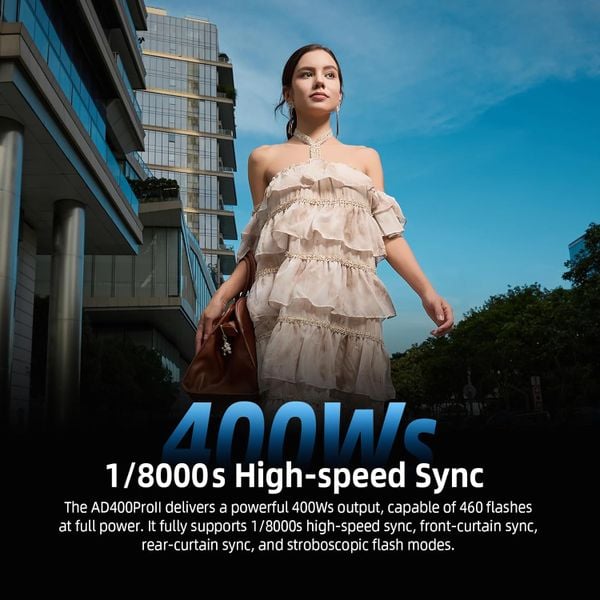- Đèn flash chất lượng cao với chế độ đóng băng cực nhanh: Đèn flash AD400Pro II cung cấp công suất 400W với 10 mức điều chỉnh, từ 1/1 đến 1/512 giây, tăng dần 0.1 giây. Bộ pin rời cung cấp tới 460 lần nháy ở công suất tối đa, nhiều hơn so với phiên bản AD400Pro trước đó. Phiên bản II cũng có chế độ HSS hoạt động với tốc độ màn trập lên đến 1/8000 giây, mang đến chế độ đóng băng tiện lợi với thời lượng nháy từ 1/3470 đến 1/27770 giây để bắt kịp chuyển động. Ngoài chế độ đóng băng, AD400Pro II có thời lượng nháy bình thường từ 1/230 đến 1/16120 giây.