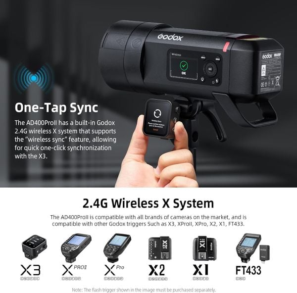 - Hệ thống không dây X 2.4 GHz tích hợp sẵn: Chức năng đèn flash có thể được thực hiện trực tiếp trên máy hoặc không dây thông qua hệ thống không dây Godox X tích hợp sẵn với phạm vi hoạt động 328 feet, 16 nhóm, 32 kênh và 99 ID. Việc điều khiển từ xa yêu cầu mua thêm bộ kích hoạt riêng. Sử dụng các mẫu XPro, XPro II và X2 tùy chọn, hoặc X3 để đồng bộ dễ dàng chỉ với một lần chạm. Cổng đồng bộ 3.5mm cung cấp chế độ kích hoạt đồng bộ có dây. Mặc dù AD400Pro II được trang bị bộ thu không dây 2.4 GHz, nó cũng hoạt động với tín hiệu 433 MHz bằng cách kết nối Godox FR433 tùy chọn qua cổng USB-C.