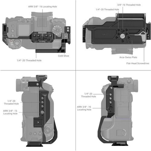 Máy ảnh gắn vào lồng bằng vít 1/4"-20 và hai khóa bên giúp giữ máy ảnh của bạn cố định tại chỗ. Đế kiểu Arca tích hợp cho phép gắn trên đầu giá ba chân hoặc gimbal tương thích với Arca mà không cần tấm máy ảnh. Hai giá treo giày tích hợp cung cấp các điểm đính kèm tiện lợi cho các cánh tay khớp nối, màn hình bên ngoài và các phụ kiện khác. Lồng kết hợp nhiều ren phụ kiện 1/4"-20 và 3/8"-16 và các ren 1/4"-20 ở mặt trước tạo điều kiện gắn hộp mờ, giá đỡ ống kính hoặc kẹp que.
