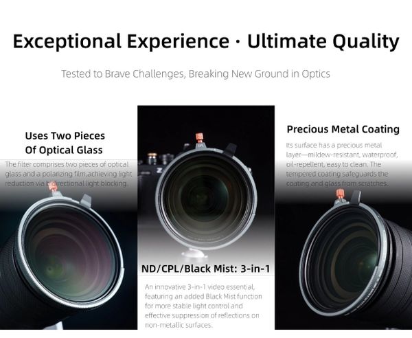 Bộ lọc này sử dụng hệ thống gắn ren truyền thống, có phạm vi ND thay đổi từ 1,5 đến 8 điểm dừng. Nó cũng kết hợp các chức năng của bộ lọc phân cực và sương mù đen, mang lại khả năng kiểm soát ánh sáng ổn định hơn. Điều này có hiệu quả ngăn chặn phản xạ từ các bề mặt không phải kim loại trong khi tạo ra tính thẩm mỹ mềm mại, điện ảnh—biến nó thành một công cụ tất cả trong một mạnh mẽ cho những người sáng tạo video.