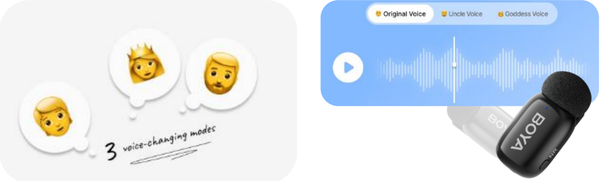 - 3 chế độ thay đổi giọng nói: Với 3 chế độ thay đổi giọng nói — Original, Deeper và Sweeter — BOYA mini mang đến sự vui nhộn và sáng tạo cho âm thanh của bạn, giúp bạn hoàn hảo cho các buổi phỏng vấn và quay phim trực tiếp năng động.
