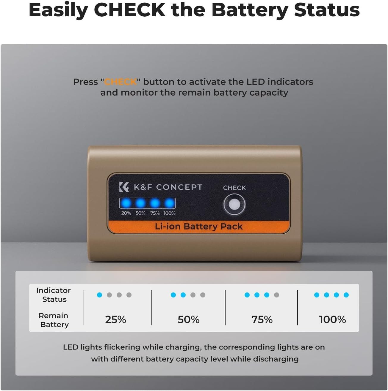 - 4 đèn LED Mức pin lần lượt là 25%, 50%, 75% và 100%. Chỉ cần nhấn nút "KIỂM TRA" để kích hoạt các đèn báo để kiểm tra trạng thái pin.