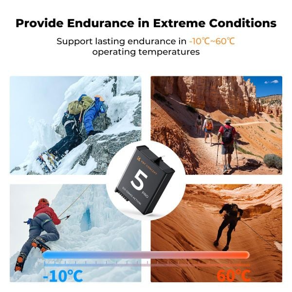 - Thời gian quay phim kéo dài Bao gồm ba pin Action 5 Pro/4/3 dung lượng cao 2100mAh (3,87V) để cung cấp nguồn điện lâu dài hơn, hoạt động trong môi trường từ -10°C đến 60°C, lý tưởng cho việc trượt tuyết, đi bộ đường dài trên sa mạc và quay phim dưới nước.