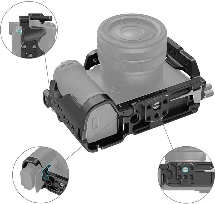 - Điểm đặc biệt của SmallRig Cage 4422 không chỉ bao gồm một khung bảo vệ máy ảnh, mà còn một khóa cố định cho cáp HDMI. Khung máy ảnh được kết nối chặt chẽ với máy ảnh thông qua ốc vít 1/4″-20 ở dưới và ốc vít M2.5 ở bên phải, được bảo vệ bằng đệm tích hợp để ngăn chặn trầy xước không mong muốn.