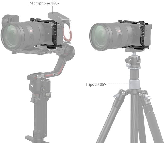 - SmallRig Cage 4422 còn hỗ trợ nhiều điểm gắn phụ kiện, bao gồm lỗ ren 1/4″-20 và lỗ định vị ARRI 3/8″-16. Nó cũng được trang bị lỗ gắn nhanh Arca Swiss ở dưới khung, giúp chuyển đổi nhanh chóng giữa chế độ cầm tay, tripods, hoặc gimbal DJI RS 2 / RSC 2 / RS 3 / RS 3 Pro.