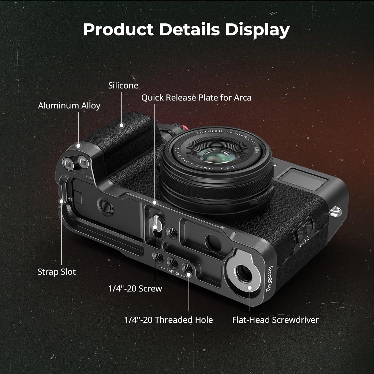 - Khả năng tương thích: Báng cầm hình chữ L này được thiết kế tùy chỉnh cho máy ảnh FUJIFILM X100VI và X100V. Tay cầm được gắn chặt bằng một vít 1/4"-20 nằm ở phía dưới. Nó phù hợp với kết cấu và cách phối màu của thân máy ảnh, vừa khít khi lắp vào.
