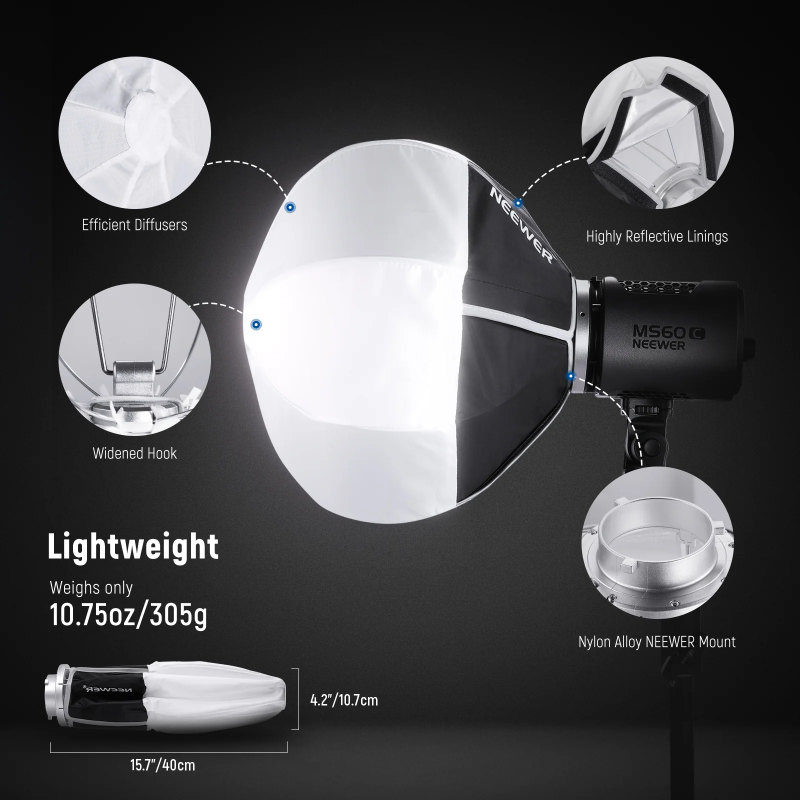- Tháo và gấp nhanh một bước - Được thiết kế với cấu trúc tích hợp, hộp mềm cho phép đóng mở tức thì chỉ bằng một bước đơn giản. Nó cũng có thể gập lại với kích thước 4,2"x4,2"x 15,7"/107x107x400mm và nằm gọn trong túi bảo quản để dễ dàng vận chuyển. Tận hưởng khả năng điều khiển ánh sáng liền mạch trong tầm tay, giúp bạn tiết kiệm thời gian và công sức. Đây là sự thay thế thuận tiện và hiệu quả hơn cho các phiên bản truyền thống
