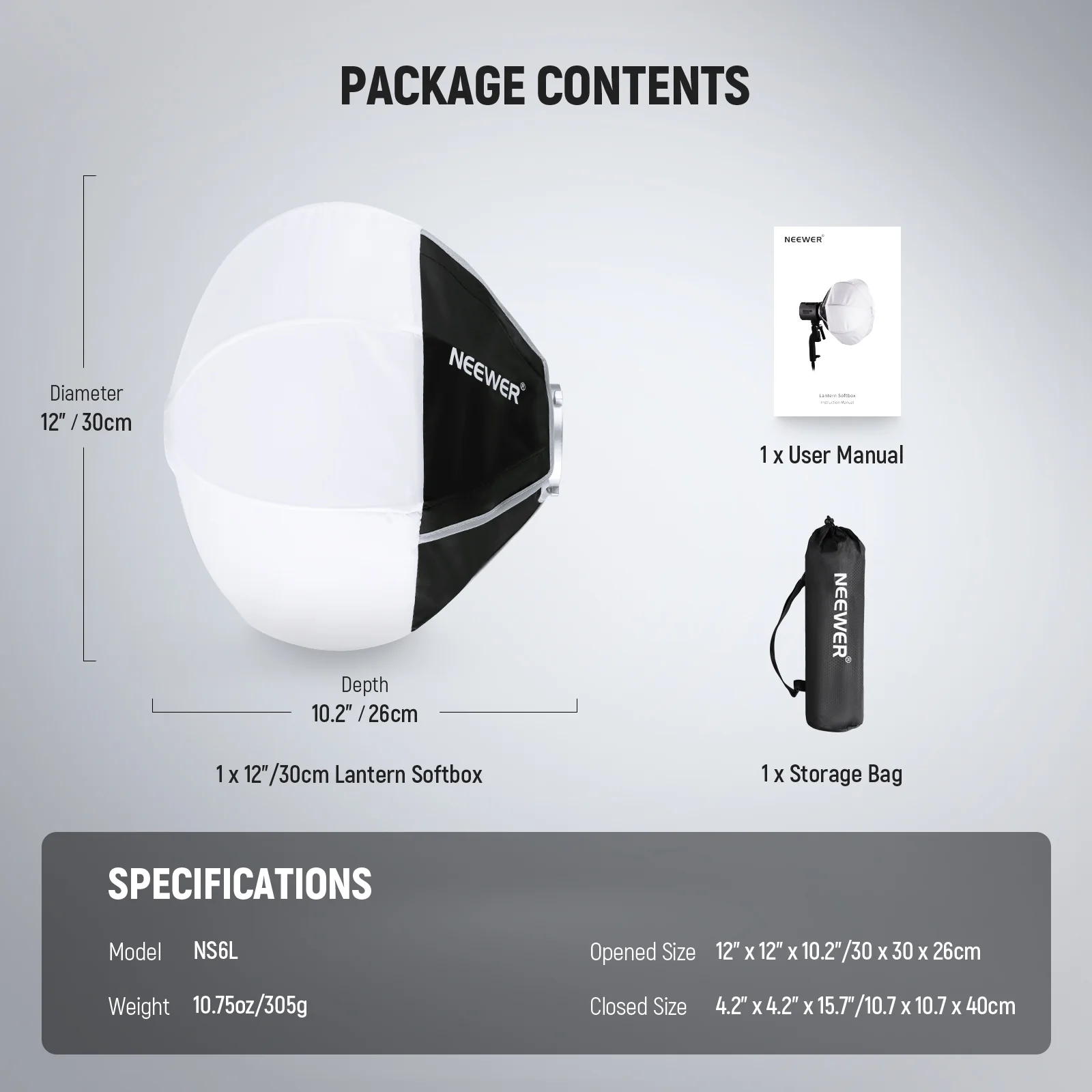- Hộp mềm đèn lồng có ngàm NEEWER - Hộp mềm đèn lồng 12"/30 cm này chỉ tương thích với đèn video LED mini NEEWER MS60 MS60B MS60C MS150B. Kích thước nhỏ gọn khiến nó trở thành lựa chọn lý tưởng cho các thiết lập ánh sáng dịu nhẹ cầm tay ngoài trời khi di chuyển, cho phép chuyển đổi nhanh chóng giữa các thiết bị NEEWER bộ điều chỉnh ánh sáng và nhiều phụ kiện hơn với bộ điều hợp gắn NEEWER (Lưu ý: Không phải Mount Bowens)