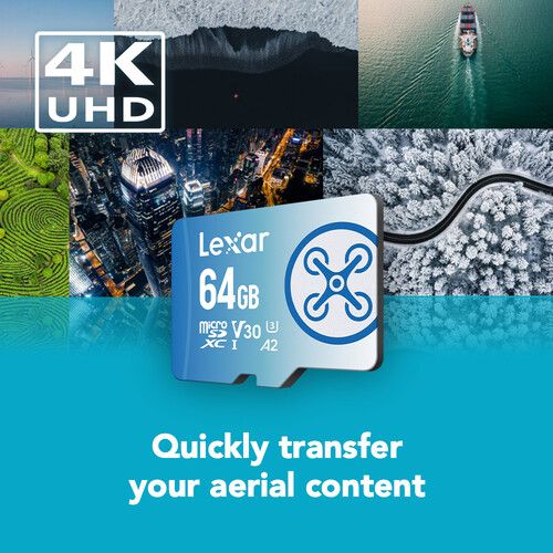 - Được thiết kế để cung cấp hiệu suất đáng tin cậy cho máy quay hành động và máy bay không người lái, Thẻ microSDXC FLY UHS-I 64GB của Lexar cho phép bạn nhanh chóng chụp và truyền các tệp phương tiện, bao gồm video UHD 4K và Full HD, cũng như ảnh thô và JPEG cũng như chụp liên tục nhanh. Thẻ này được xây dựng với bus UHS-I và cung cấp tốc độ đọc lên tới 160 MB/giây và tốc độ ghi lên tới 60 MB/giây. Cũng được hỗ trợ là các xếp hạng cấp tốc độ video Class 30 (V30) và UHS Speed Class 3 (U3), cả hai đều cung cấp tốc độ ghi được đảm bảo không giảm xuống dưới 30 MB/s.