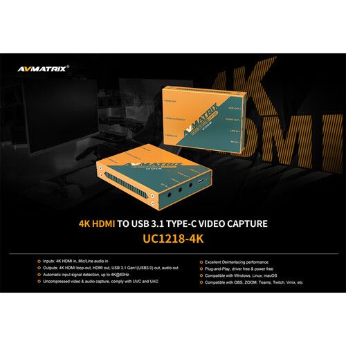 - Thiết bị quay video 4K HDMI sang USB-C 3.1 thế hệ 1 này của AVMATRIX cung cấp tín hiệu video UHD đến PC của bạn để phát trực tuyến plug-and-play. Nó có một đầu vào HDMI 2.0 và một đầu ra nối tiếp HDMI 2.0 cũng như đầu ra HDMI tiêu chuẩn để giám sát hiệu quả.