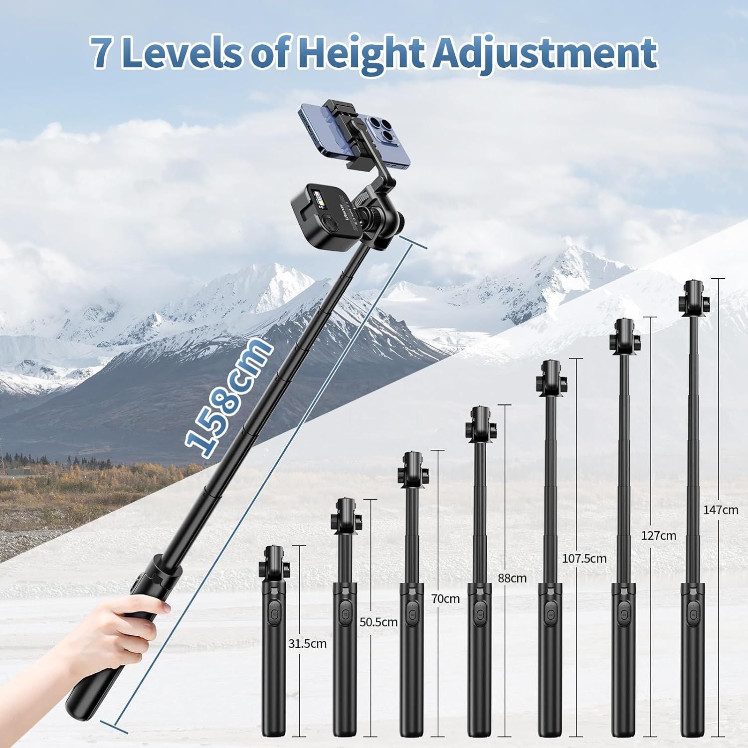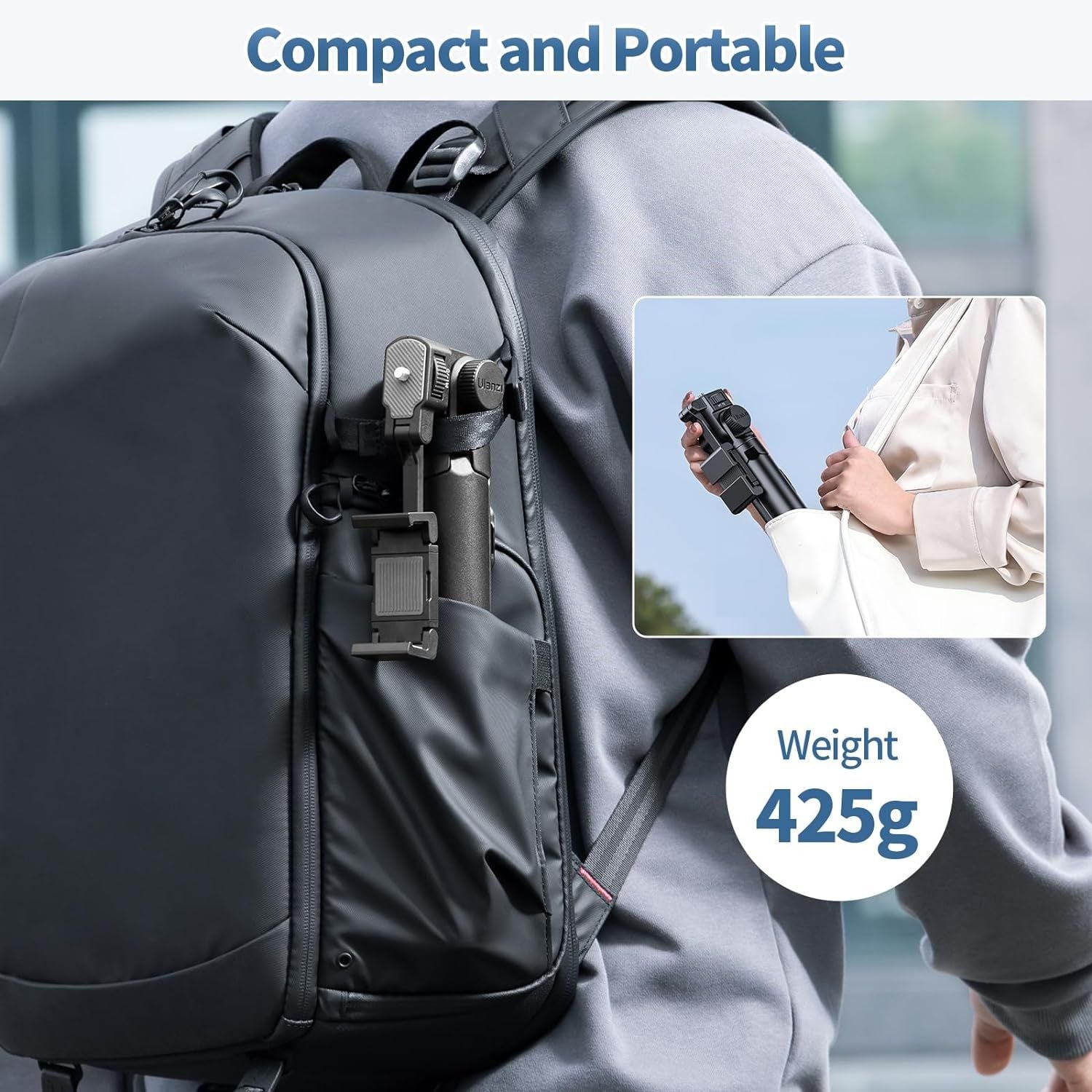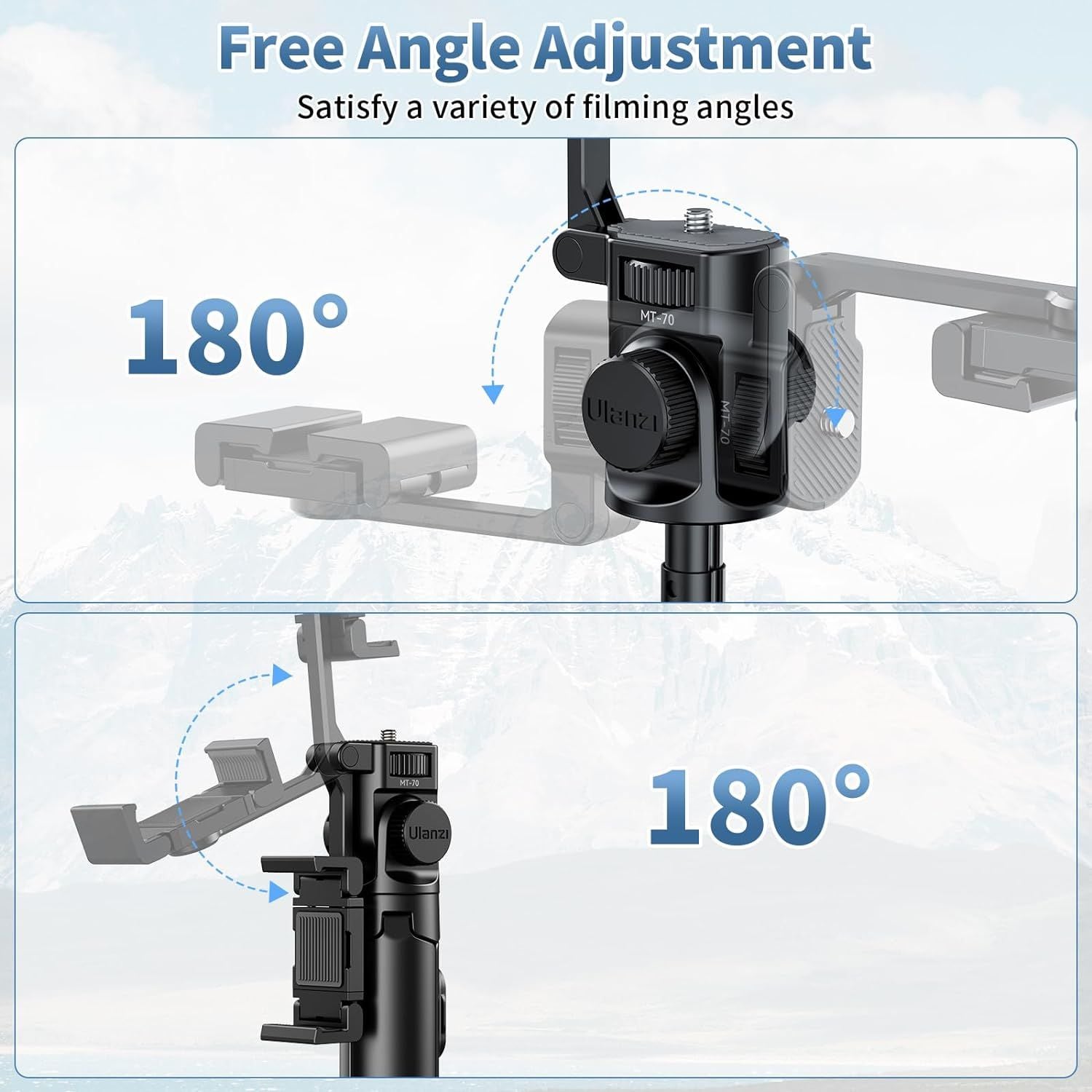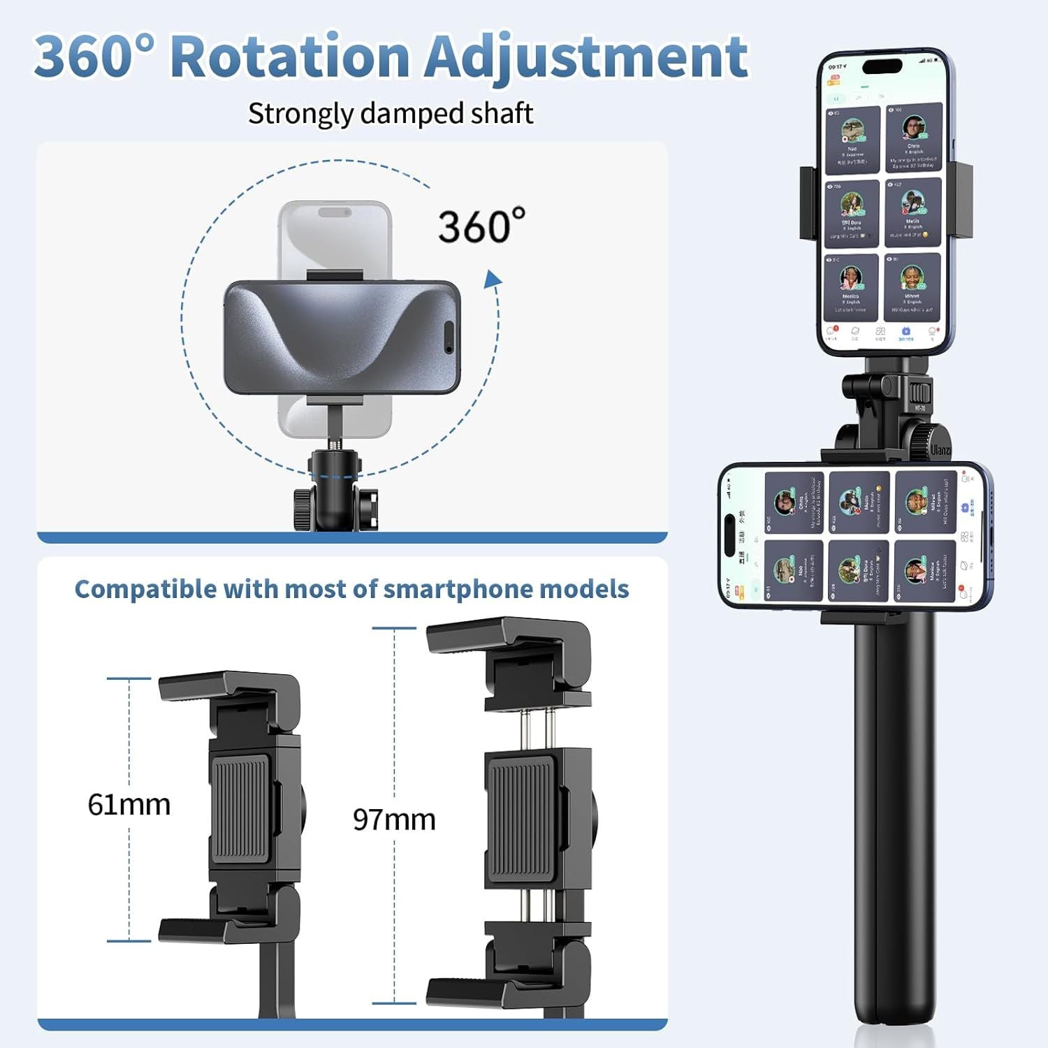 - Thiết kế giá đỡ hai vị trí Chân máy ULANZI MT-70 được nâng cấp thiết kế, chân máy ảnh và điện thoại di động phổ thông với 2 giá đỡ điện thoại di động, Kẹp có thể điều chỉnh là kẹp điện thoại di động phổ thông 61-97 mm, tương thích với hầu hết các điện thoại thông minh. Nó cũng đi kèm với một giá đỡ điện thoại di động, có thể được sử dụng để chụp ảnh bằng camera kép hoặc làm máy nhắc chữ cho các cảnh phát sóng trực tiếp.