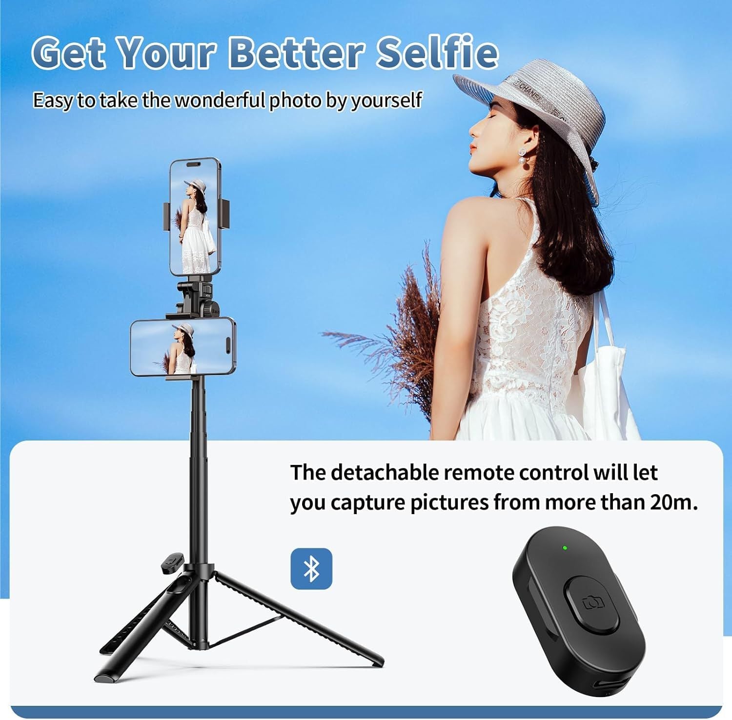 - Điều khiển từ xa không dây có thể tháo rời Điều khiển từ xa không dây có thể được ghép nối ngay lập tức với điện thoại của bạn để Chụp ảnh tự sướng nhiều ảnh trong phạm vi 20 M/66FT, nó có thiết kế có thể tháo rời và có thể được cất giữ trong rãnh.