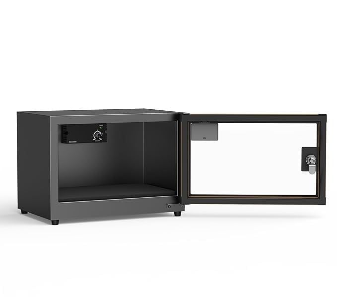 - Tủ trang bị cục hút ẩm công nghệ IC làm lạnh, đồng hồ đo ẩm LCD, cửa kính trang bị khóa và chìa khóa